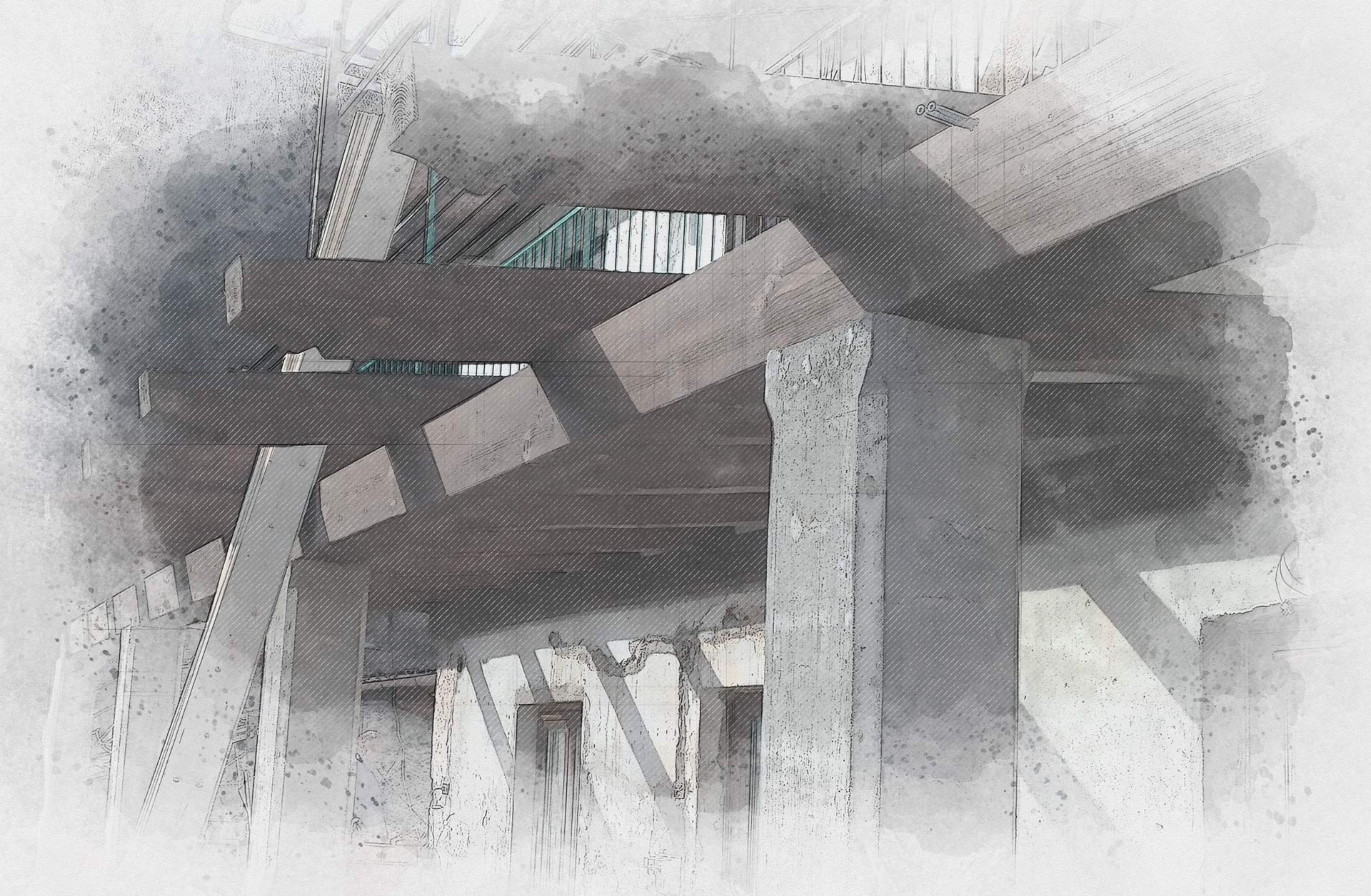 Realizzazione di portico e copertura per scala esterna in legno lamellare, copertura con lamiere similcoppo antichizzate.